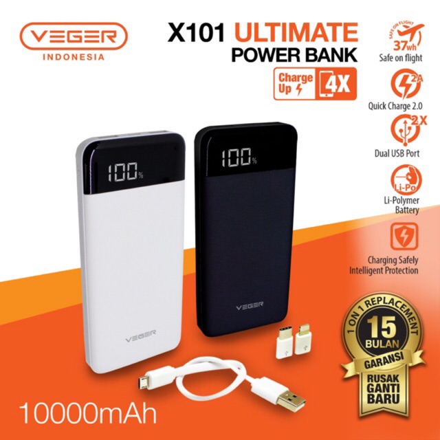 Aksesoris HP Item ID: #8340PowerBank Veger X101 10.000mAh ReProduct Information:PowerBank Veger X101 10.000mAh Re Specification: Model : X101 Capacity :10000mAh / 37Wh Battery : Li-Polymer Micro USB Input : 5V-2A Type-C Input : 5V-2A USB 1 Output : 5V-1.0A USB 2 Output : 5V-2.1A included in box 1 Powerbank 1 Kabel micro 1 Converter USB Micro to USB Lightning (iPhone 5/6/7/8/X/XS) 1 Converter […] Item DescriptionPowerBank Veger X101 10.000mAh Re Specification: Model : X101 Capacity :10000mAh / 37Wh Battery : Li-Polymer Micro USB Input : 5V-2A Type-C Input : 5V-2A USB 1 Output : 5V-1.0A USB 2 Output : 5V-2.1A