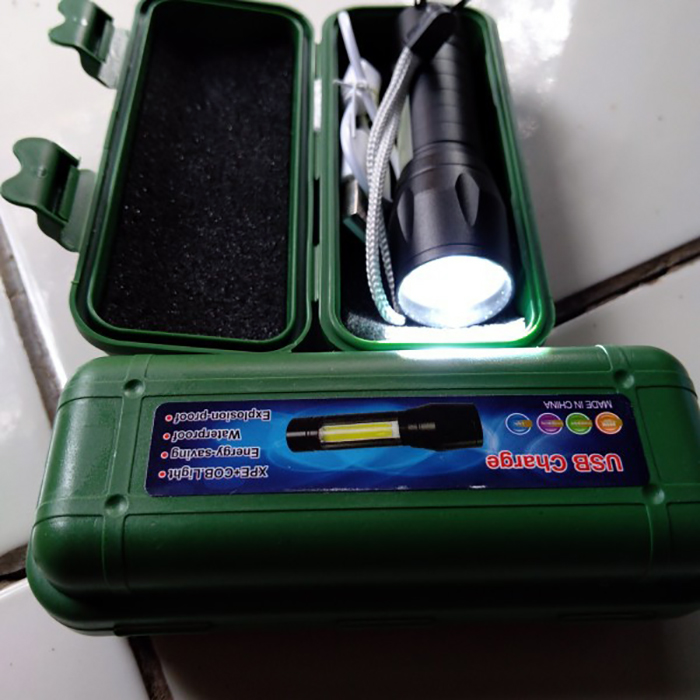 Senter Swat mini yang super terang dengan 3 mode: senter biasa, kelap kelip dan lampu cob (lampu di gagang senter) Spesifikasi: