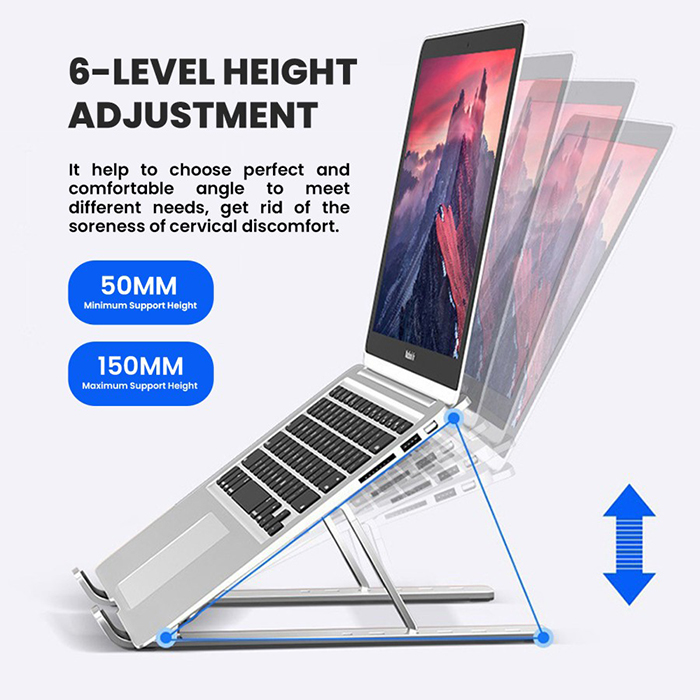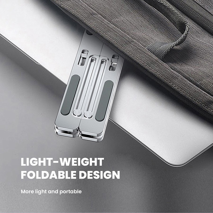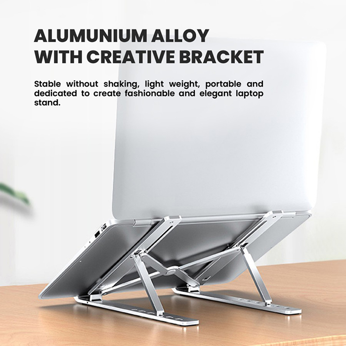 • Aluminium Alloy Material; Menggunakan material aluminium alloy terbaik yang di design sedemikian rupa untuk mendapatkan kekuatan topangan yang baik pada saat digunakan sehingga tidak mudah bergetar pada saat menggunakan laptop untuk mengetik (mampu menahan berat laptop hingga 15kg*).