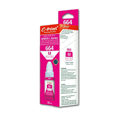 Merupakan refill tinta untuk printer Epson warna merah (magenta) seri 664.Cocok dipakai untuk printer Epson seri: L100, L110, L120, L200, L210, L220, L300, L310, L350, L355, L550, L555, L565, L360, L365, L800, L1300. Keunggulan e-print L series:
